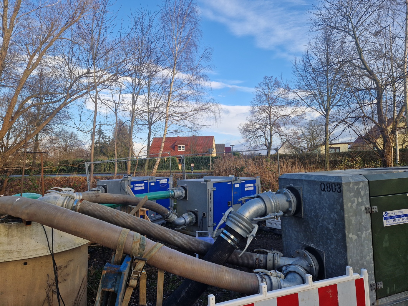 Under sommarmånaderna tenderar det stillastående vattnet att slamma. Under hela byggperioden var säkerhet av yttersta vikt för klienten hos den lokala myndigheten i östra Tyskland för att säkerställa att inga olyckor inträffade. Eventuella fel eller funktionsfel kunde ha orsakat betydande skador och kostnader. Alla pumpar behövde gå med maximal kapacitet hela tiden för att pumpa ut den totala volymen på cirka 1200 m³/h via det 450 m långa rörsystemet. Detta ledde till "miljökollaps" eftersom det inte finns något naturligt in- eller utflöde.
